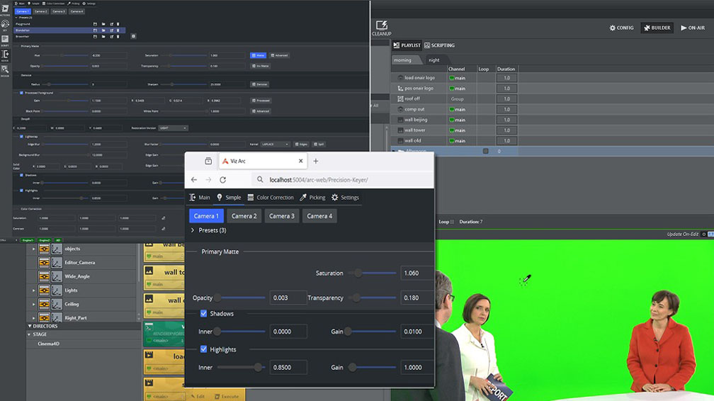 Viz Arc 控制介面,內建業界最強大的色鍵去背合成,支援精準色鍵的智能自動調整功能,簡化Viz Virtual Studio Go 的佈署流程。透過介面快速存並控制所有的XR 圖像內容,可調控色彩與Logo,輕鬆部屬並控制 PTZ3 UHD Plus 攝影機。