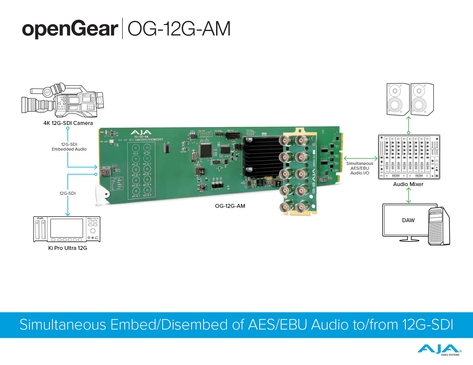 AJA OG-12G-AM I/O 影音介面卡具有 16 通道 openGear AES/EBU 音訊內嵌/解嵌功能,支援 12G-SDI 4K/UltraHD 輸入和輸出。 使用者可控制頻道 AES/EBU 音訊嵌入/解嵌、12G-SDI 輸入音訊解嵌、或嵌入 AES/EBU 輸入音訊,以 BNC 連接器設定執行音訊輸入或輸出。 AJA OG-12G-AM 具備自動偵測或手動設定輸入視訊格式。支援 SDI 工作流程,以 12G、6G、3G 和 1.5G 四通道 SDI 訊號轉換為單通道 SDI 訊號, 還支援雙鏈路和雙流轉換。同時支援Quadrant和2SI輸入和輸出映射。