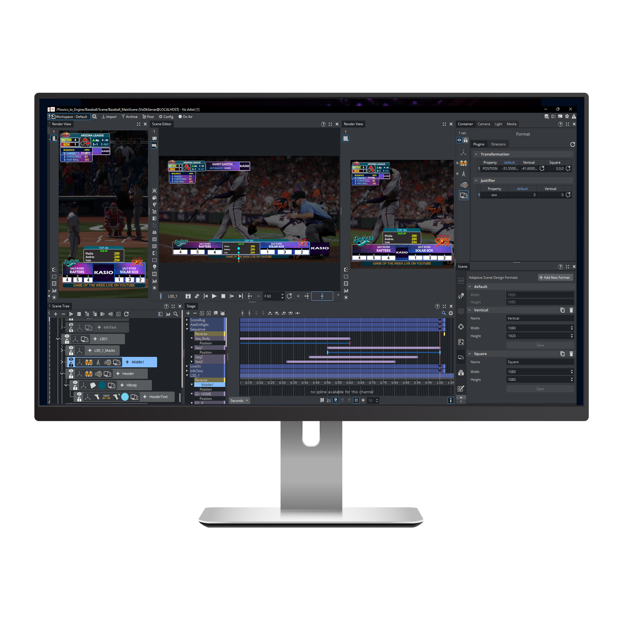 一次設計,隨處發布。突破格式與解析度的限制。有了 Viz Engine,您的團隊只需要設計一次,就可以輕鬆進行擴展,輕鬆完成從廣播到 OTT 再到行動裝置的任何輸出。