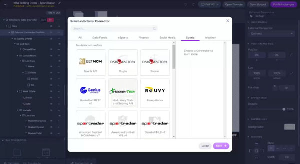 Viz Flowics 系統附加資料連接器,支援多種資料格式,已整合大多數市面上運動、天氣、金融、電競等,最熱門的資料供應商數據庫。