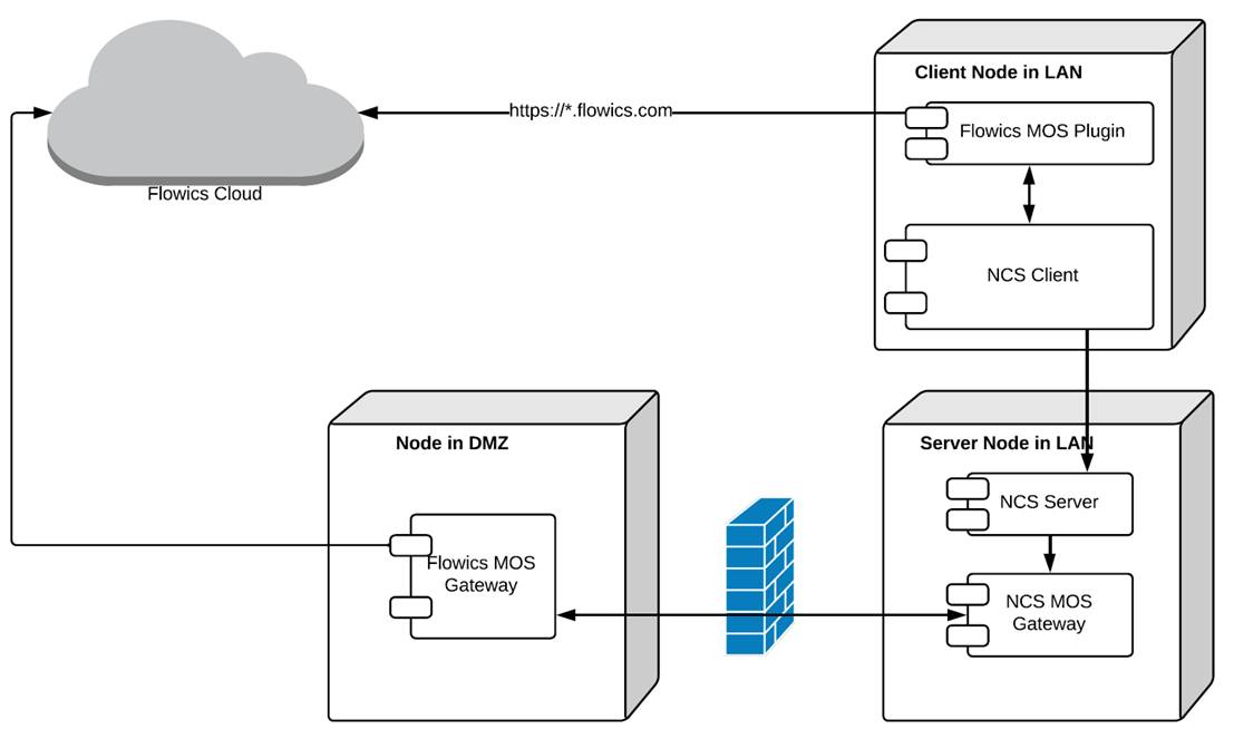 原生雲製作 Viz Flowics MOS 閘道可在 Linux 或 Windows 作業系統上安裝執行,透過網路配置 NRCS 伺服器。